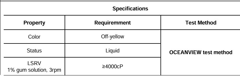 OceanVis-ODG-PL solutions show a strong ability of water retention capacity, salt tolerance, suspending power, and thermal stability ranging from 5 to 150 °C. It is stable across a wide pH range and can be used in weighted and unweighted drilling fluids, completion fluids, and other systems.
