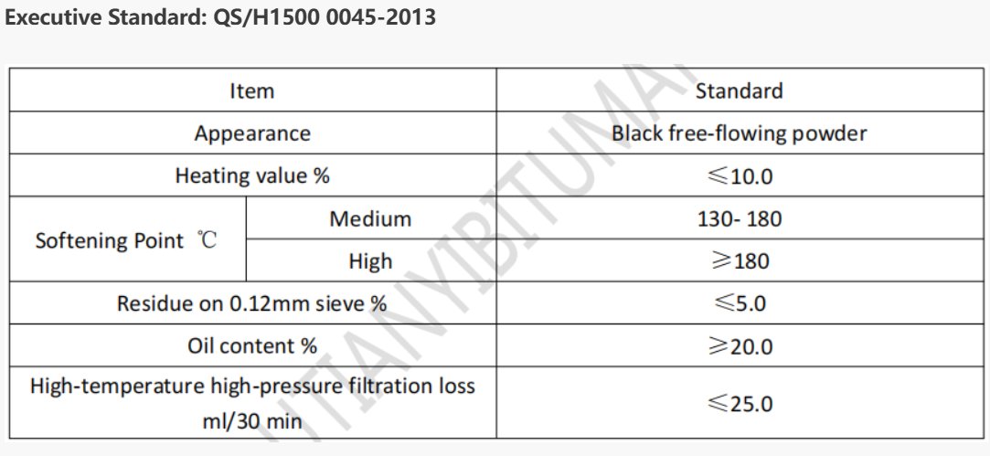 Usage: This product, in fine particle or powder form, can be used in drilling fluids as a controller for high-temperature and high-pressure filtration loss, wellbore stabilizer, lubricant, etc. The dosage is generally 1%-3%. It can also serve as a viscosifier and filtration loss reducer in oil-based drilling fluids. In larger granules, it can be used as a granular bridging agent in combination with other materials for bridging and plugging leaks. For example, it can be formulated into hard asphalt cement plugging slurry for plugging operations, with a formula of 50kg cement + 25 to 50L water + 20 to 90kg asphalt.